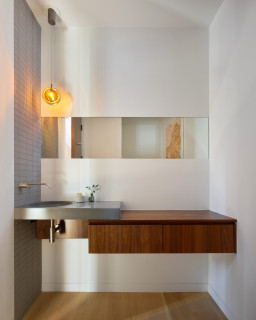 A wooden panel with a live edge supports a simple sink ttucked into a corner of this wedge-shaped Encinitas, California, baronial home Blythe Interiors. A green herringbone floor adds texture and color, while a beige zellige tile backsplash, an irregular mirror, a woven pendant lamp and floral accents enhance the organically modern style.