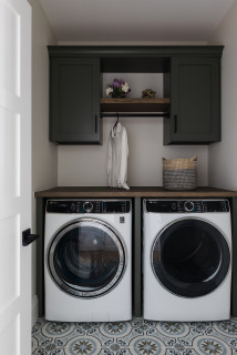 Avoid a light and airy color palette in favor of dark purple cabinets, walls and millwork, April Gahagan of FS Design Group gave this laundry room a rich, layered look. Because the space that came to life Judd Builders in North Carolinait also serves as a side foyer, powder room, and pantry — a high-traffic space, in other words — the designer carefully balanced aesthetics with practicality. For example, wallpaper with a dragonfly is placed higher, above a sturdier wall covering, to protect it from danger. And the floor is a durable brick, which is given a lofty look thanks to different shades and a herringbone pattern.