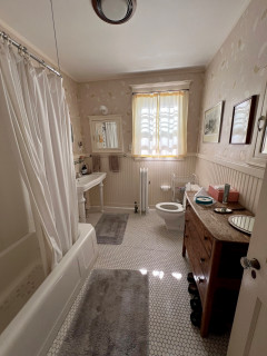 The bathroom also includes a ceiling light-fan-heater combinationa feature the homeowners appreciated in the original room. To make the space more energy efficient, Greenberg’s team clad exterior wall for additional insulation and replaced the old window with a historically appropriate one reproduction.