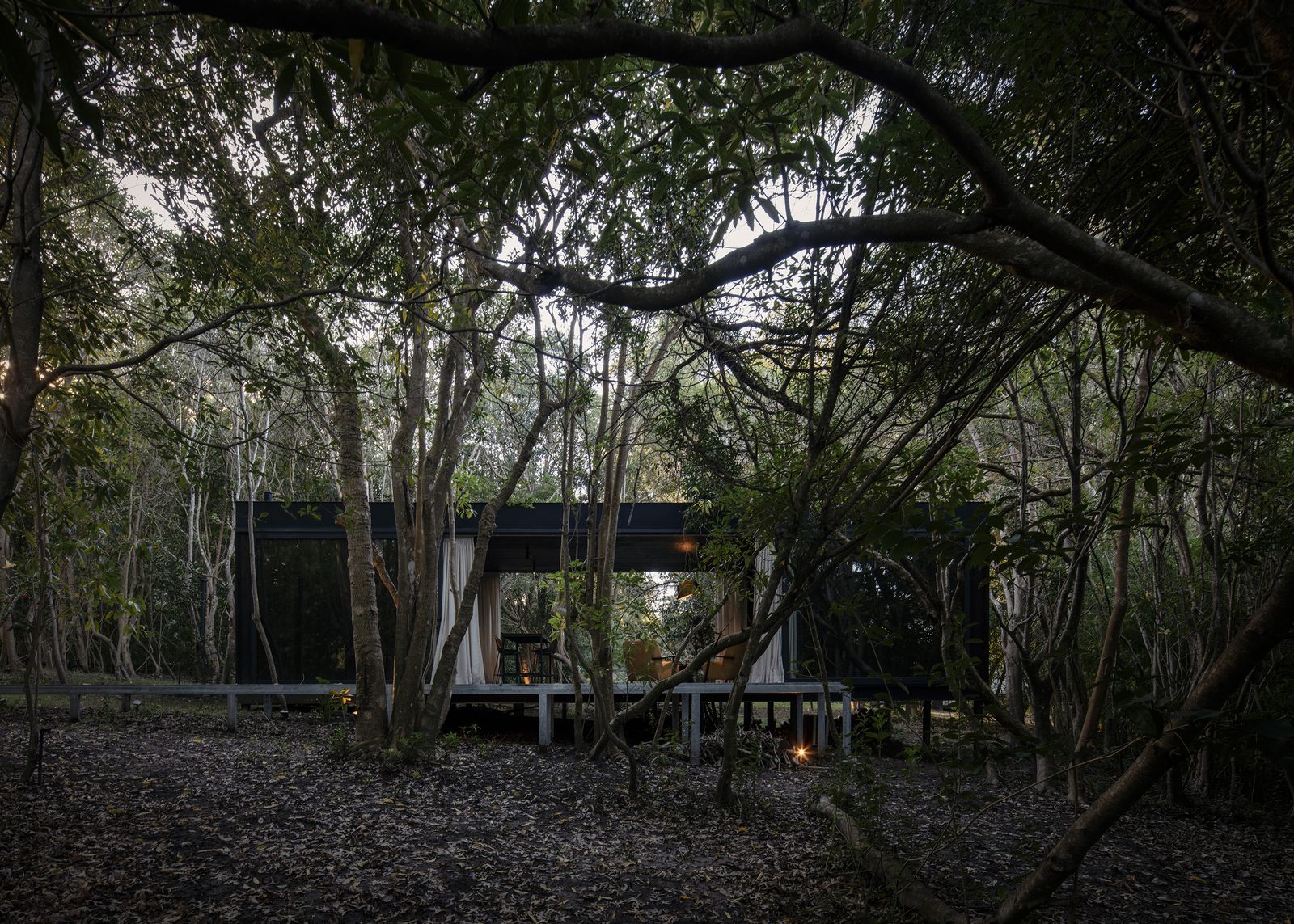 “The design is based on one rectangular volume of pure geometry, within which two internal bodies define three clearly differentiated zones along their longitudinal axis. Facing the street, the service spaces for storage and hygiene are arranged behind an almost completely opaque facade, providing privacy and shelter for the entrance. In the center, an external side space opens with the effect of a social stay. achieved by a sliding system panels that run along the outside of the walls, allowing the opening to completely clear. At the back of the site is a resting area, conceived as a space for contemplation: a double bed placed between two solid side walls, facing a large fixed glass panel that runs from floor to ceiling and from wall to wall, creating the feeling of sleeping among the trees.